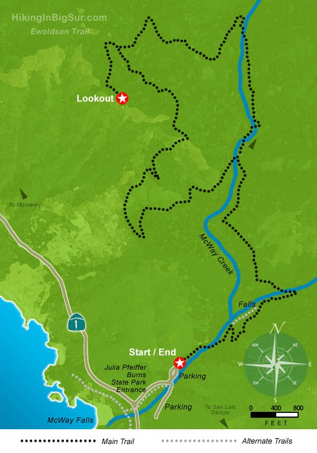 Julia Pfeiffer Burns State Park is about 37 miles south of Carmel and 12 miles south of Pfeiffer Big Sur State Park. You can either drive in the park, pay the daily fee of $ 10 or park on the side if it’s available. Look for the Ewoldsen/Canyon trail sign at the eastern end of the parking area.